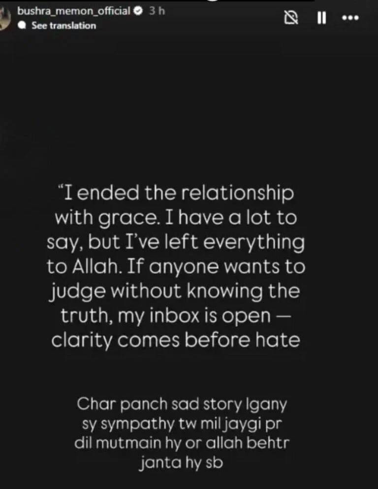 تاہم اب بشریٰ میمن نے انکشاف کیا ہے کہ انہوں نے اپنے اس رشتے کا اختتام کر دیا ہے۔